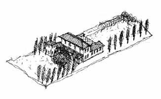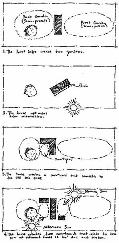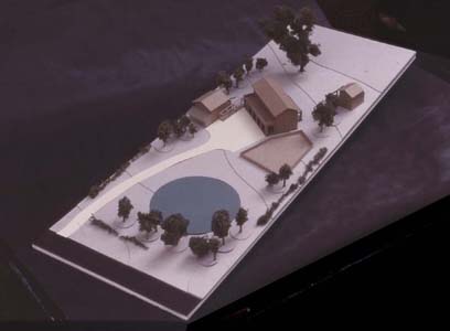 With the site analysis and the overall building vision in hand we begin to study the potential siting of the buildings. We are especially alert to how the new construction affects the existing landscape structure. With the Hoff's residence we wanted to place the main body of the building project close to the Old Oak, so that it would begin to benefit from its presence, and create a sheltered space around it, but not so close that is would be competing with the special energy of this venerable tree. We saw that placing a large building mass near the tree started to divide the site into two areas. The area around the tree was quite nice, but this left an area between the building and the road that had to be repaired and enhanced. The landscape designers suggested that a swimming pond would provide a strong center to the front area of the site. In terms of the solar orientation we had to reconcile several factors. The main view was to the north, parallel with the long boundaries of the site. However, true south is at an angle to the street and property line grid. The proposed solution both acknowledges the street grid and orients positively to the sun. We build very rough site models, at 1/8"=1'-0". All of the components are movable. We use the model in conjunction with actual staking out on the site to determine the preliminary location of buildings. We have found in situations with expansive building programs and sites that it often makes sense to break the mass of the structure up into a main house and more modest outbuildings. In this way, we maintain a comfortable human scale, adopt a more open relationship to the landscape, and facilitate incremental or phased development. In the Calistoga residence the main house and carriage house form an ell that encloses a courtyard open on one side to the east sun and neighboring hills.