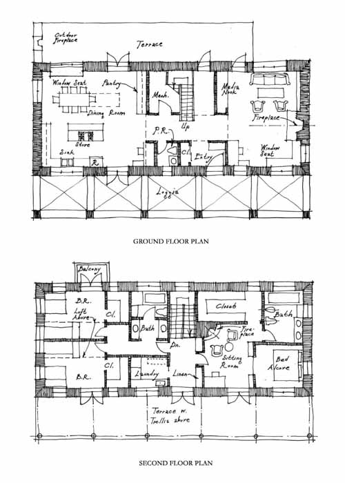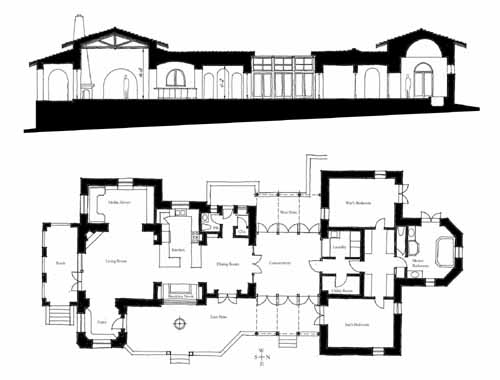 Human activities define the environmental patterns and typologies of buildings. These responses are unique to a place and its inhabitants. A critical part of the design process is understanding the project's particular system of significant patterns and transforming this network to realize the emergent vision. The structure of the plan itself follows from the social structure of the client's family or community. The project narrative allows us to utilize this structure to form a functional building plan. In the Lakeport residence (building section and plan above) we had an expansive attenuated site, with a good amount of topographical variation, and a building program that required that the family members spend a good amount of time on their own. Consequently the main building plan itself reflects the variety of the site, and provides many places for privacy and contemplation. Conversely, the Calistoga plan (floor plans below) is much more compact and intimate. We often are in the position of persuading our clients to build smaller buildings, as this is one of the primary ways we can pursue sustainable design. With the Calistoga residence a family of four originally came to us with a rough plan for an 8,000 square foot building. After they showed us these plans we visited the clients in their present residence, a small ranch home. It was clear that they were very close to each other, in fact, the two teenage daughters, when we asked them what was important to them, they said they wanted their bedrooms close their parents. We suggested that the plan for their new house was at least twice as big as it needed to be. We are now in construction, with a four bedroom main house that is 2,500 square feet and a garage/studio that is 1300 square feet. So it's not just about the size of the ecological footprint. Socially, within the culture of this family, a smaller house is what they really wanted. They just didn't know it. They were looking at the fabled "resale value". Another thing that came out of this meeting was, that the clients did want to be close to each to each other, but the layout of their present home made them feel they needed a bigger home. What they needed was a better layout for their house, internally, that allowed for both intimacy and privacy and also a house that was better connected to usable exterior spaces, extending into and bringing in the landscape.