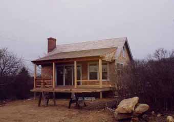 This compact house (less than 800 square feet) on Martha’s Vineyard that sits atop a hill overlooking Menemsha Harbor was designed and built in 1989, inspired by the local shingled houses. It is sited among the existing trees and shrubs as if it had always been there. It utilizes the pattern of “Site Repair” from A Pattern Language, restoring a neglected part of the property. |