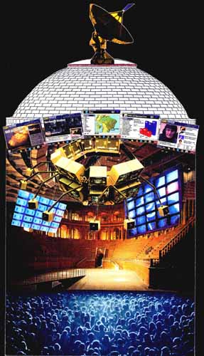 This project won an award in Progressive Architecture magazine's "New Public Realm" competition in 1992. It proposes a community town hall for the global village. The proposal is based on the premise that although we are living in the information age, consumer technology has contributed to our isolation and passivity--we learn of world events from the safety of our fortress-like homes. Our society struggles to find clear statements of common purpose, yet the democratic process is undermined by the lack of interaction. Moreover parts of society are disadvantaged by not having the access and skills to use existing communication technology. The proposed community media centers would address these problems by functioning as a forum for public dialogue, a mixture of library and town hall that would enable communities to research any issues and then debate courses of action. |