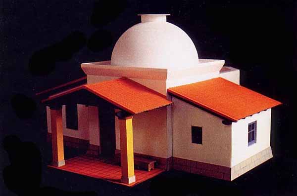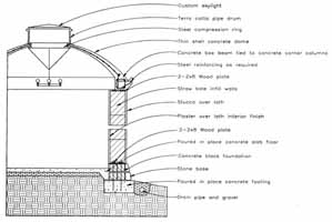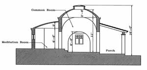 The clients expressed a desire for a quiet sanctuary removed from the activity of the main house. In addition to the front porch there are two small writing studios, a domed common work room, and a small meditation chamber. The cottage forms a center in the simply landscaped garden. The cottage was designed by Christopher Andrews in 1994 so it could be built by the owners themselves. The walls are straw bale with a concrete frame. The dome is reinforced concrete without any formwork.