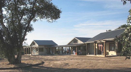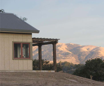 This project was designed for three lifelong friends who have pooled their resources to make a home for themselves in the Salinas Hills overlooking Monterey Bay. The site was an old horse ranch, atop a ridge, with 360 degree views and excellent solar access. The clients were drawn to the casual feel of the area's vernacular agricultural buildings and the dramatic native landscape. The program is simple-each member of the house treasures their privacy and wants to maintain their autonomy, yet they also come together as a family for meals and communal relaxation. Their three individual suites are similar in size, with detailed variations to suit their inhabitants. The Great Room is straw bale construction, grand in scale, with tall timber trussed ceilings and cozy niches built into the walls. Chris worked on this project with Skillful Mean Design & Construction. |