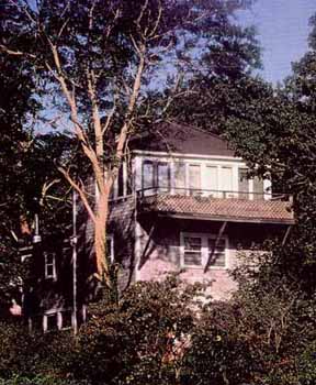 This guest house was designed and built in Martha’s Vineyard in 1987. The plan includes a tower lookout with a panoramic view of the harbor and bay that serves as a writing studio for the owner. A special effort was made to preserve the site’s existing vegetation on this restricted site and harmonize with the shingle style context. The scheme for the house utilizes the pattern "Long Thin House" from A Pattern Language, and was also inspired by a neighboring windmill. |